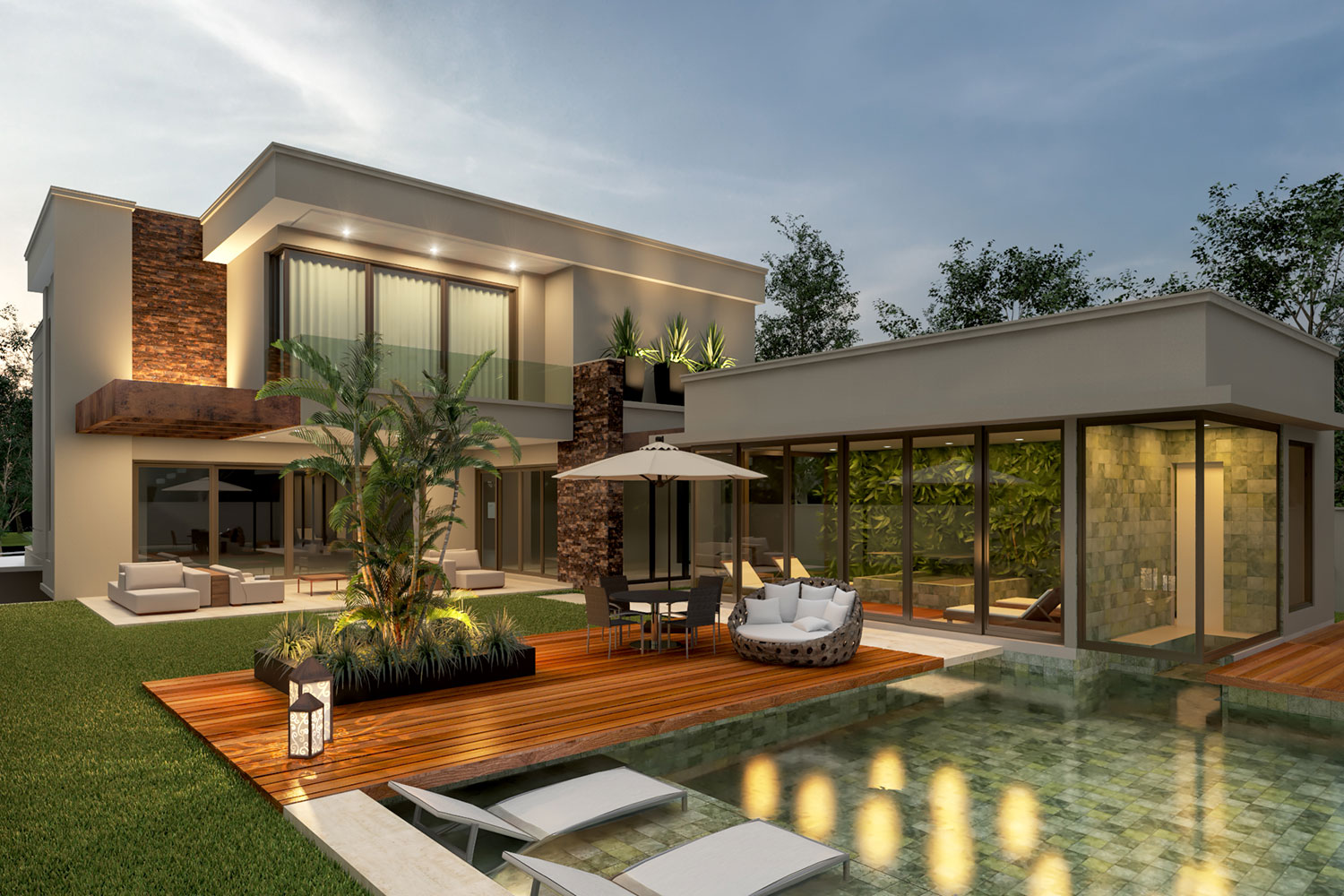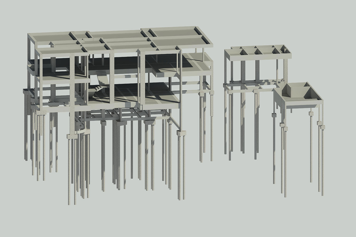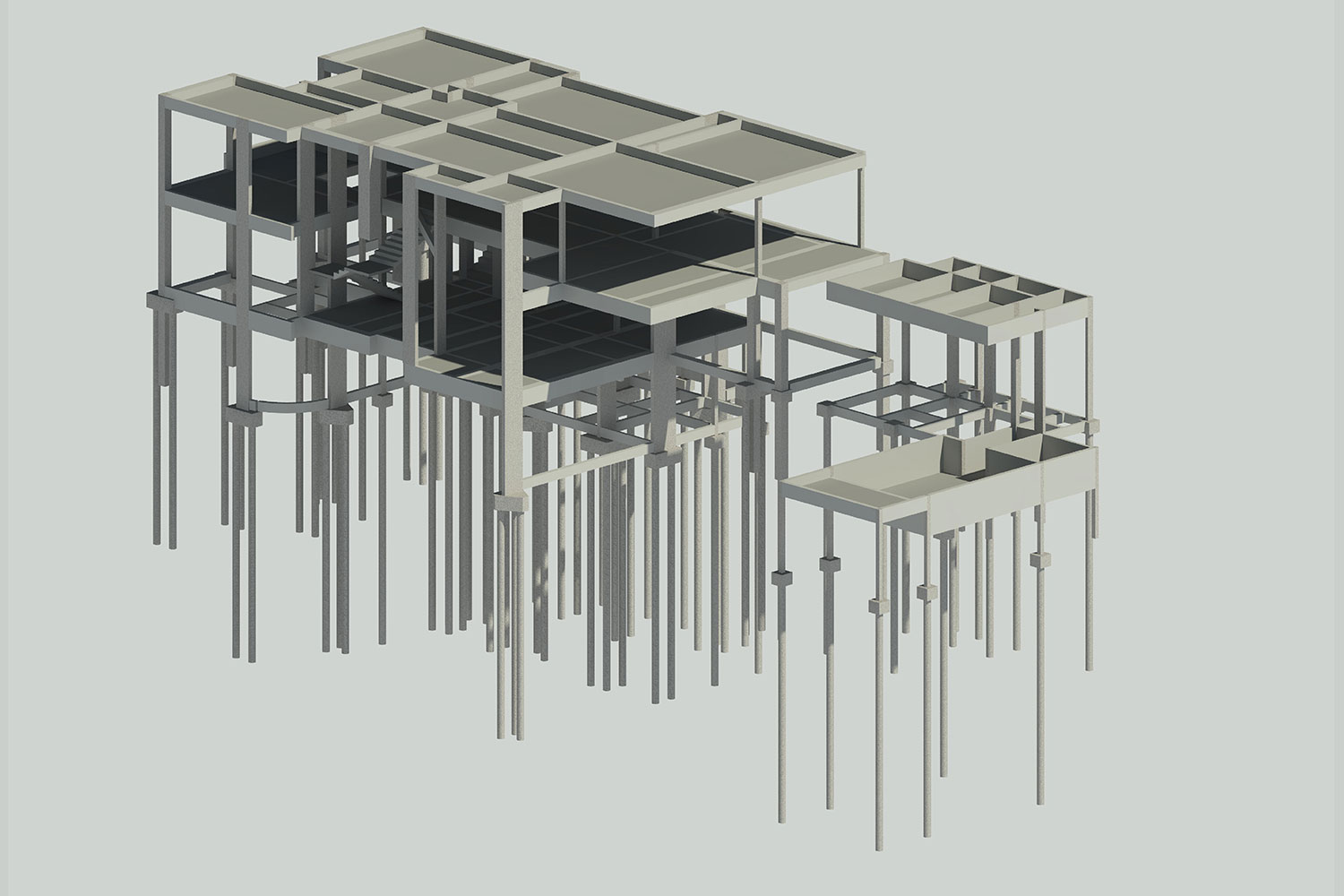 Sondagem mostrou solo arenoso intercalado com pedra rolamento, nível de água a 3,6 metros e SPT nos primeiros metros de 3 golpes para 30cm. Analisando as condições do solo decidimos adotar estaca raiz como partido. Outra particularidade da obra foi a utilização de diversas vigas de transição (pilares nascendo nas vigas), requerendo uma técnica mais apurada na concepção estrutural, devido ao projeto arquitetônico.