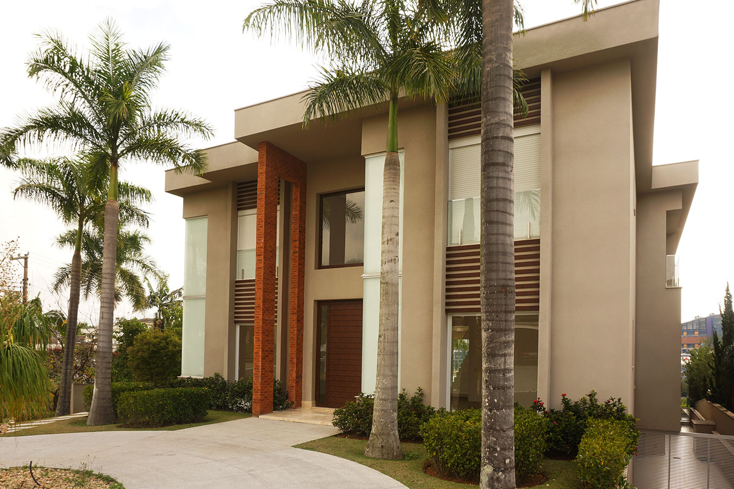 Alguns detalhes arquitetônicos acabam trazendo desafios para os projetos. Para executar o projeto arquitetônico de forma fiel precisamos estar sempre trazendo soluções criativas para as obras. Nesse caso, para garantir a lareira suspensa, trazendo a sensação de estar flutuando, utilizamos os chamados tirantes, conhecidos por ter sua carga depositada na viga superior e sem nenhum apoio no chão. Dado o tamanho da residência, também utilizamos as vigas de transição para viabilizar grandes espaços sem pilares.